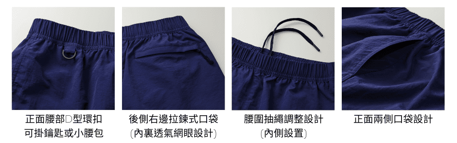 經典色系、布料輕薄透氣、不過寬或過短的適中版型。正面腰部處有可掛上鑰匙或小腰包的D型環、後側口袋為拉鍊式設計,即使在激烈活動下也可以預防東西掉出。
